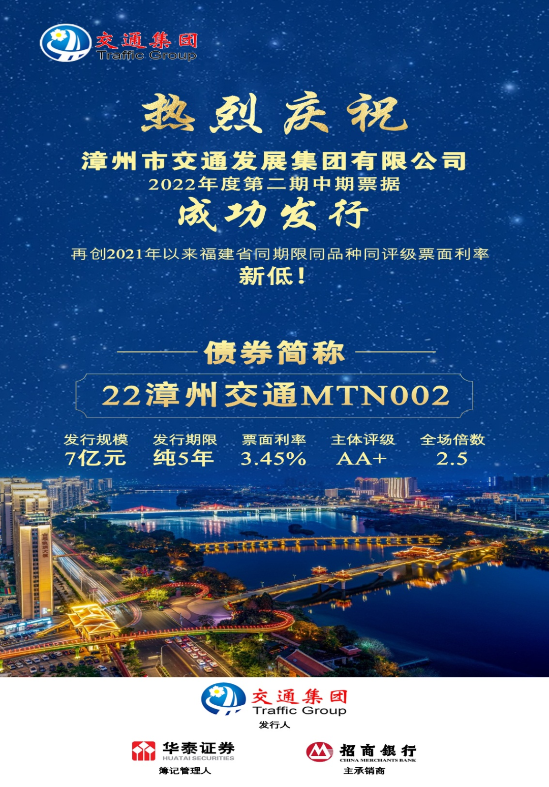 由華泰證券、招商銀行主承的漳州交通集團(tuán)2022年度第二期中期票據(jù),2022年10月20日由簿記發(fā)行,發(fā)行規(guī)模7億元,期限5年,票面利率3.45%,認(rèn)購倍數(shù)2.5倍。
