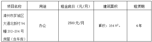 漳州市大通北新村94幢202-204號(hào)房屋承租人?,F(xiàn)將具體事項(xiàng)公告如下:一、租賃標(biāo)的物(標(biāo)的物以現(xiàn)狀為準(zhǔn)):