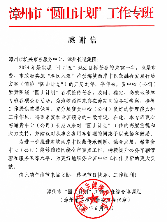 福建省深入學習“千萬工程”經(jīng)驗推進鄉(xiāng)村全面振興現(xiàn)場會近期在漳州市東山縣舉行,《漳州市實施“名醫(yī)入漳”推動海峽兩岸中醫(yī)藥融合發(fā)展行動方案(試行)》(簡稱“圓山計劃”)項目正式啟動。長運集團市直機關公務用車服務平臺承擔了本次兩項重大活動公務用車保障工作,為來賓在漳期間的各項考察、接待工作提供優(yōu)質用車服務。